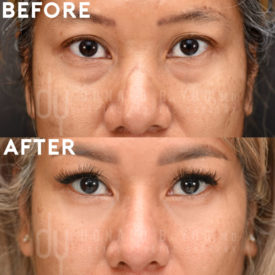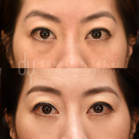 Lower Blepharoplasty with Fat RepositioningBefore and After lower blepharoplasty with fat repositioning to improve the appearance of undereye bags and tear troughs. A hidden incision is used on the inside of the eyelid (transconjunctival) to mobilize lower eyelid fat, which is then repositioned lower in the cheek to an area of hollowing (tear troughs) to create a smooth lid-cheek contour. She also underwent a DCF Rhinoplasty and alarplasty with Dr .Yoo.