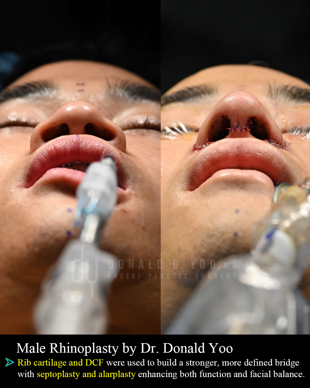 Asian Rhinoplasty with Rib Cartilage and DCFBefore and After surgical #YOOnose Asian rhinoplasty with rib cartilage and diced cartilage fascia (DCF) to lengthen and refine the nose. Extended spreader grafts, a septal extension graft, and tip refining grafts were used to project and reshape the patient\'s tip. A diced cartilage fascia (DCF) graft was used to augment the dorsum.
