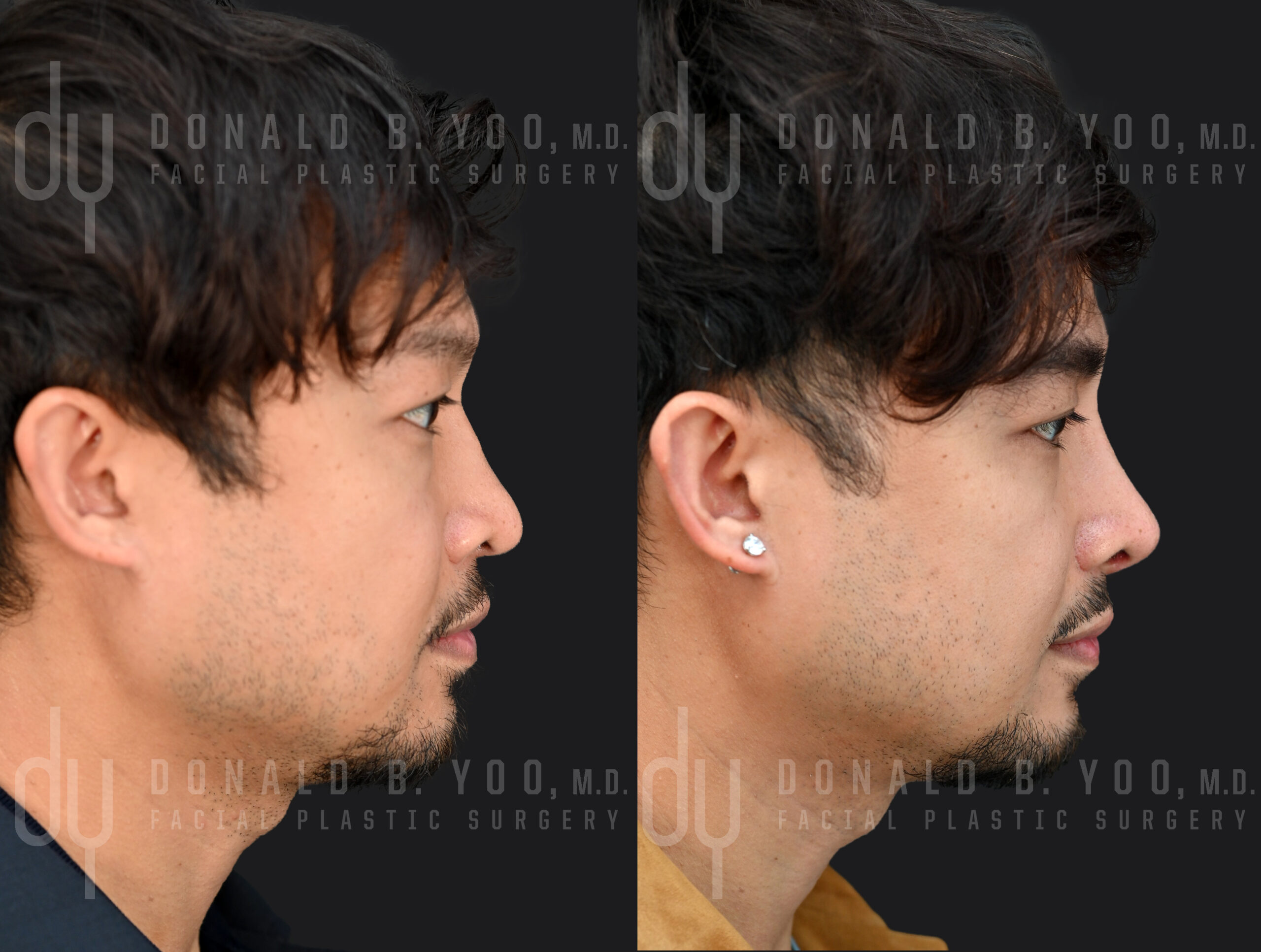 Male Rhinoplasty with Rib Cartilage and DCFThis patient underwent male revision rhinoplasty with alarplasty performed by Dr. Donald Yoo, using DCF (diced cartilage fascia) rib cartilage for structural reconstruction. Revision rhinoplasty in male patients often requires strong, durable support to correct prior surgical changes while maintaining natural masculine definition. In this case, rib cartilage was utilized to restore nasal framework, improve stability, and achieve balanced proportions, while alarplasty was performed to refine nostril width and enhance overall nasal harmony. The goal of treatment was to correct previous surgery, improve structural integrity, and deliver a natural, long-lasting result that respects male facial anatomy. -