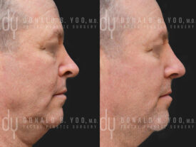 Revision Rhinoplasty with Rib Cartilage and DCFAfter two previous rhinoplasties this patient was left with alar retraction, pinched nostrils, and significant nasal obstruction. Restoration revision rhinoplasty with rib cartilage and composite grafts from the ears were used to improve the airway and restore a natural appearance to his nose.